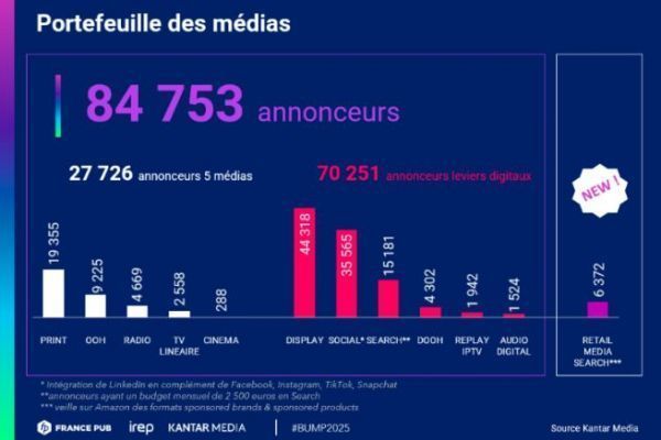 The advertising market brings together 84âeuros753Â advertisers. A third of them invest in the five traditional media, while digital accounts for 83%.